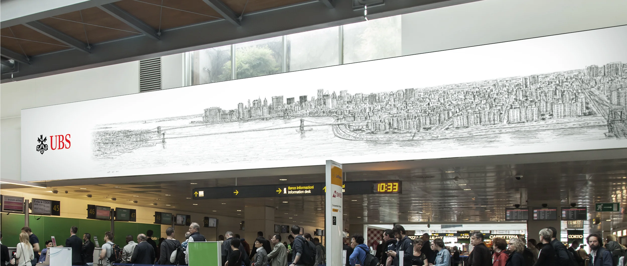 The resulting drawing became a billboard at an airport international arrivals hall.